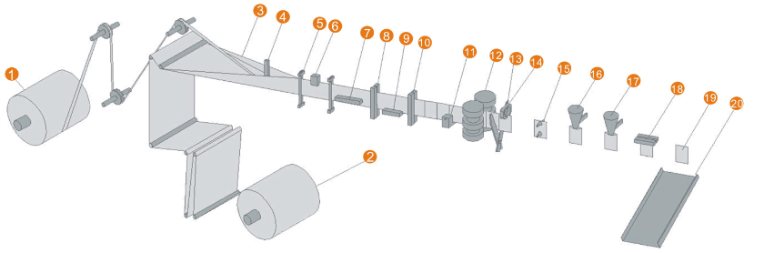 1.放拉鏈機構(gòu) 2. 放膜機構(gòu) 3.包裝膜成型 4. 拉鏈導(dǎo)向 5. 包裝膜導(dǎo)向 6. 色標(biāo)檢測 7. 上封拉鏈 8. 豎封拉鏈機構(gòu)I 9. 底封機構(gòu) 10. 豎封機構(gòu) 11.易撕口裝置 12. 伺服牽袋 13. 剪切機構(gòu) 14. 夾袋 15 開袋機構(gòu) 16. 充填I(lǐng) 17. 充填I(lǐng)I 18. 上封 19.. 成品 20. 成品輸出