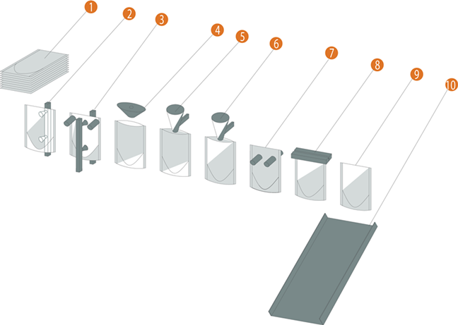 1.預(yù)制袋疊放 2. 翻轉(zhuǎn)取袋機(jī)構(gòu) 3. 開袋機(jī)構(gòu) 4. 吹氣機(jī)構(gòu) 5. 一次灌裝 6. 二次灌裝 7. 展袋 8. 上封 9. 成品 10. 成品輸出