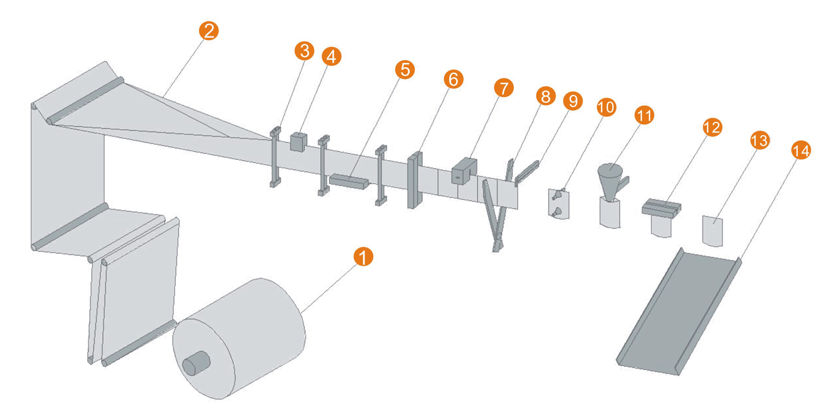 1. 放膜機(jī)構(gòu) 2. 包裝膜成型 3.包裝膜導(dǎo)向 4. 色標(biāo)檢測(cè) 5. 底封機(jī)構(gòu) 6. 豎封機(jī)構(gòu)I 7. 易撕口裝置 8.剪切機(jī)構(gòu) 9.牽袋機(jī)構(gòu) 10. 開袋機(jī)構(gòu) 11. 充填機(jī)構(gòu) 12. 上封機(jī)構(gòu) 13. 成品 14. 成品輸出